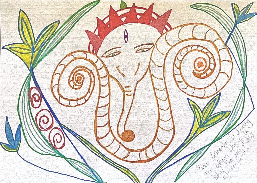 The Third Eye, depicted in gold between the Trishul and the sword, symbolizes divine insight and the awakening of higher consciousness. In Vedic and Hindu tradition, it represents the Ajna chakra, the seat of intuition and spiritual wisdom, through which one perceives truth beyond the material world. It is the eye of awareness that transcends duality, guiding thought and action with clarity and purpose. Within this painting, it embodies enlightened leadership and vision, the capacity to see beyond what is visible and to govern with both wisdom and compassion.
